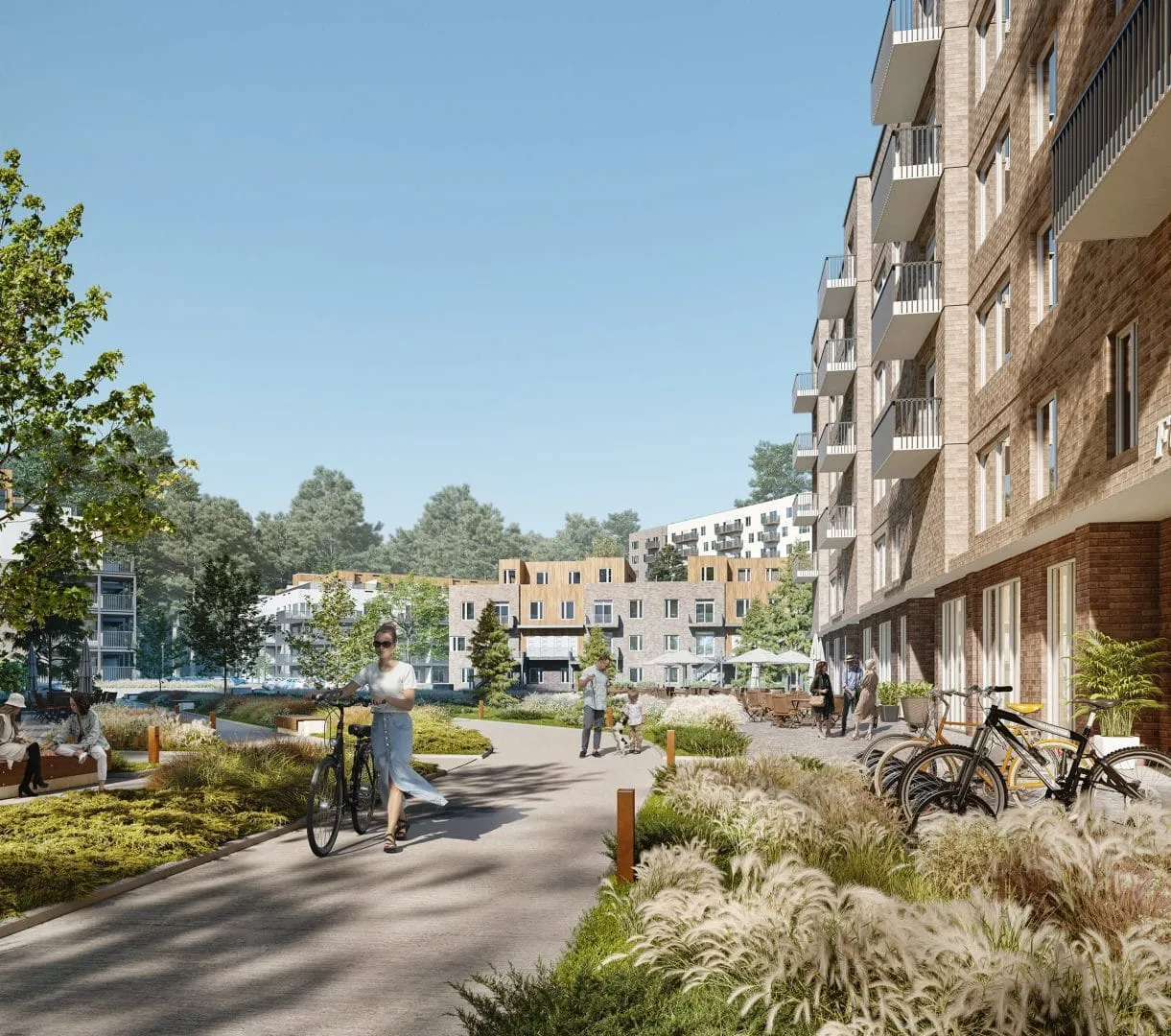 In 2001, during the land sale planning process for approximately 460,000 m², an ecological corridor of over 100,000 m² was identified and protected, along with a plot later dedicated to public infrastructure such as a school or park. This left approximately 340,000 m² for Brigil’s vision: a beautiful “15-minute neighborhood” including housing, bike paths, public gathering spaces, and numerous additional green areas, such as two green corridors and a central park.